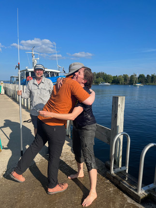 I sent everybody else out on the away party to check out Gladstone on foot, I stayed to make sure the boat didn’t drift as we were now amidst some serious whitecaps. Once the dinghy was back, we hoisted it back onto the deck for the return trip. Lori then challenged me to jump in the water and swim around the boat, a task shamefully not accomplished during our 2 previous seasons. She guilted me into it, and the water was actually pretty nice. We dried off quickly in the wind, but we both agreed that the “swim ladder” built into the hull of the Perseverance is only usable by very strong and agile persons… we need to find a better rope ladder solution to make it easier to clamber onboard from the water.